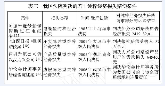 可见,我国现行民事立法并不排斥纯粹经济损失赔偿。对于近年来发生的一些典型的纯粹经济损失案件,我国法院也基本上采取了肯定态度。参见下表: