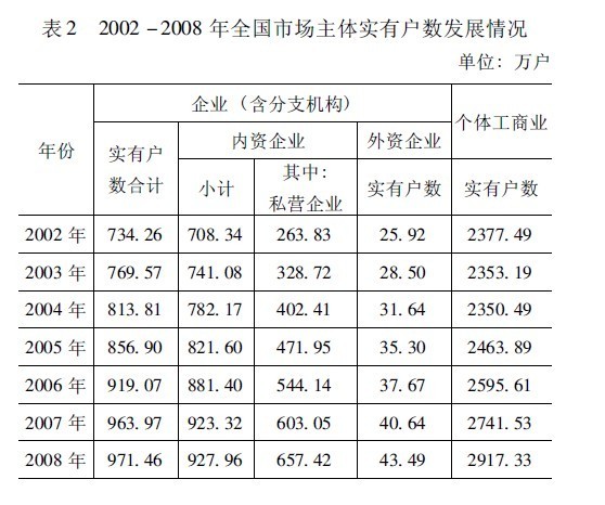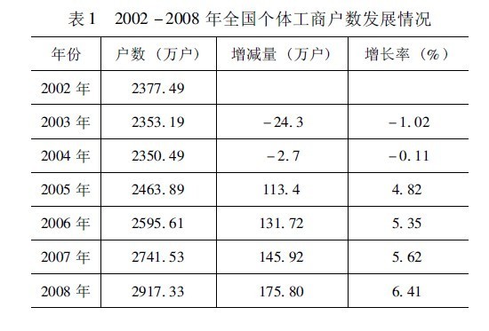 第一,个体工商户规模小,资金少,过于严格的劳动和社会保障标准可能增加其财务负担,导致经营困难。根据国家工商总局的统计数字,2008 年全国共有个体工商户为2917. 33 万户,但个体工商户资金数额为0. 9 万亿元,(注释2:参见国家工商总局《统计分析发布:2008 年全国市场主体发展情况报告》,2009 年3 月。)平均每户的资金数额仅为3. 085 万元。而同期,我国内资企业和外资企业的户数分别为927. 96 万户、43. 49 万户,注册资本(金)分别为34. 58 万亿、8. 90 万亿,平均每户的注册资本为372. 645 万元、2046. 447 万元。而且,个体工商户的雇工人数非常少,和普通企业存在较大差别。截止到2009 年3 月,全国实有个体工商户2948 万户,从业人员5809. 53 万人,(注释3:参见国家工商总局《统计分析发布:2009 年一季度全国市场主体发展报告》。)平均每户个体工商户的从业人员不足2 人。个体工商户规模小,雇工人数小,经营管理就难以规范,遵守社会保险制度的能力也不强。