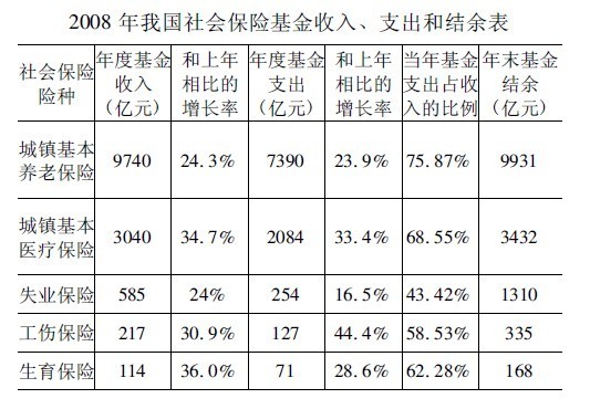 除了参保比例低之外,我国社会保险的收支结构也不够合理。2008 年,我国全年城镇基本养老保险基金总收入9740 亿元,比上年增长24. 3%,其中征缴收入8016 亿元,比上年增长23. 4%。各级财政补贴基本养老保险基金1437 亿元。全年基金总支出7390 亿元,比上年增长23. 9%。年末基本养老保险基金累计结存9931 亿元。全年城镇基本医疗保险基金总收入3040 亿元,支出2084 亿元,分别比上年增长34. 7% 和33. 4%。年末城镇基本医疗保险基金累计结存3432 亿元,其中统筹基金结存2290 亿元,个人账户积累1142 亿元。全年失业保险基金收入585亿元,支出254 亿元,分别比上年增长24% 和16. 5%。年末失业保险基金累计结存1310 亿元。全年工伤保险基金收入217 亿元,支出127 亿元,分别比上年增长30. 9%和44. 4%。年末工伤保险基金累计结存335 亿元,储备金结存50 亿元。全年生育保险基金收入114 亿元,支出71 亿元,分别比上年增长36. 0%和28. 6%。年末生育保险基金累计结存168 亿元(注释7:参见人力资源和社会保障部、国家统计局《2008 年人力资源和社会保障事业发展统计公报》)(见下表)。