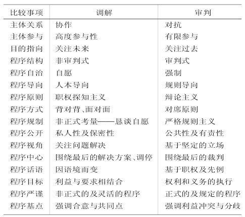 法院调解制度与审判制度有着不同的程序建构机理,前者建构于当事人的程序自治上,张扬程序的自治规则和当事人的主体性;后者建构于“对抗——判定”诉讼主线上,凸显法官对程序的控制性,奉行高度的程序保障性。简言之,当事人意思自治或合意是法院调解的正当性基础,而审判制度追求的是结果正当性和程序正当性。司法制度的发展过程一直伴随自治性和强制性的制度博弈和程序选择。不同的建构基础导致了两种纠纷解决机制在具体运作模式上有着诸多的不同: